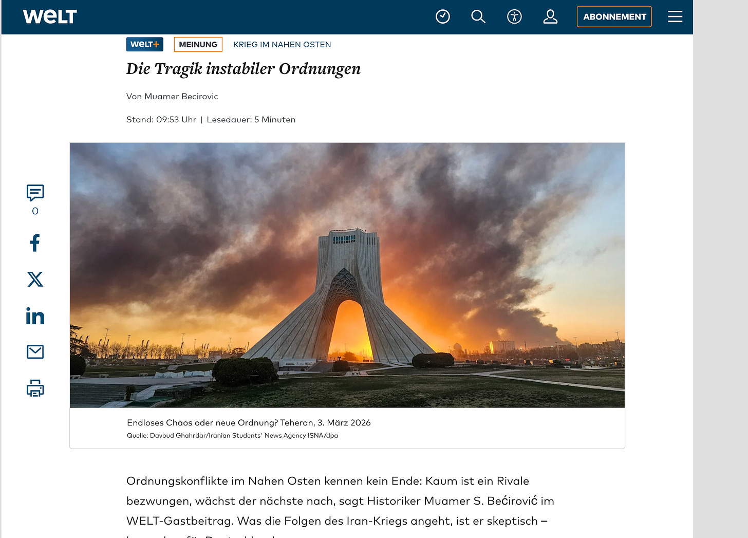 Mein neuer Beitrag in der Welt. Über das Wesen und die Zerstörung der Ordnung im Nahen Osten. Warum ab jetzt keiner mehr auf Regeln vertrauen kann, warum nur noch Bomben statt Diplomaten das Wort führen werden, warum der nächste große Konflikt bereits in den Startlöchern steht, warum dieses Chaos vor allem deutschen und europäischen Interessen schadet; und warum wir Europäer Ordnungen stabilisieren sollten, statt wie Narren zu klatschen, wenn andere sie in Schutt und Asche legen.